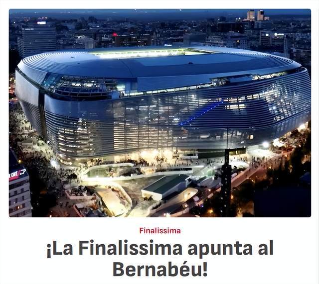 《阿斯报》指出,皇马的主场伯纳乌球场,在众多候选场地中脱颖而出,这是确定的答案,各方还在敲定一些安全细节。欧足联、南美足联均认为,伯纳乌球场是举办此类规模赛事的最佳选择。